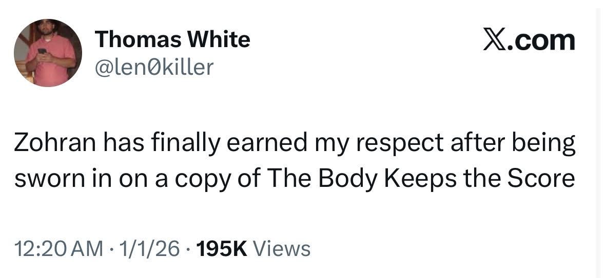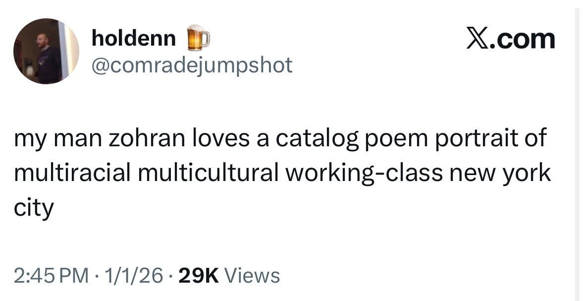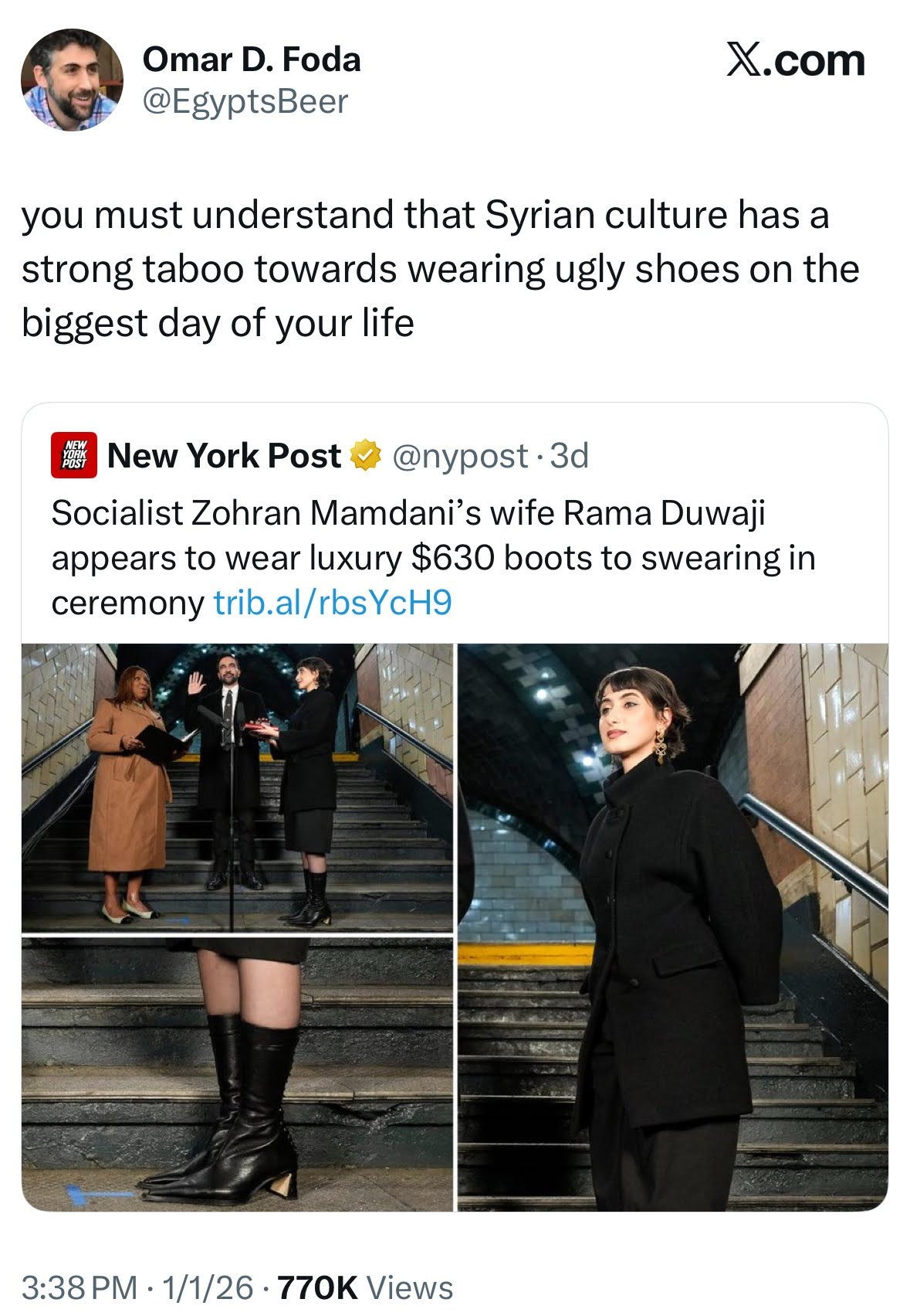 Zohran makes good choices for how to incorporate celebrity. He has a good pool to choose from. Bernie Sanders. Walton Goggins. Mandy Patinkin. He got Mero in the Desus and Mero divorce. The inauguration was a series of wins after wins. As it should be. Though I would have chosen a New Yorker, or someone more strongly associated with New York, to sing Bread and Roses, too. I would have chosen Samia over Lucy Dacus, but I always chose Samia.