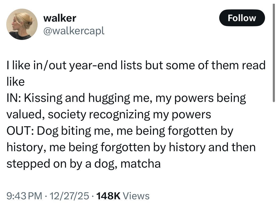 Every year, the uninspired among us write in/out lists and every year, everyone gets mad. I have been writing In/Out lists every year for the past ten years, and no one else is doing it like me. I’m mostly writing jokes while also trying to capture and understand the spirit of the next year by identifying what is particularly stale about last year. Everyone else is trying to be the next Anna Wintour and failing miserably. The first mistake everyone makes is that they’re not having fun; the second is that the lists are supposed to correspond. If something is out, it has to be replaced by something of a similar vein. If tinned fish is out (observant!), the question the author must ask themselves, the reason we’re all turning to these lists in the first place, is what will replace it as the trendy food item? As I am always saying, the format makes it fun! Otherwise, all of this is a useless exercise, and it’s a useless exercise already!