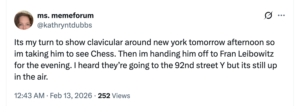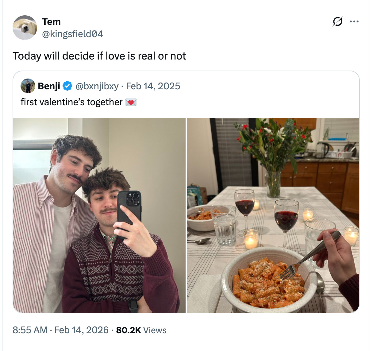 This is a lesson in playing the long game. Last year, a nice, normal gay guy posted a picture of his first Valentine's Day dinner with his boyfriend, and everyone had a meltdown as lonely people on Valentine's Day are wont to do. I think we all felt bad about it after the fact. They didn’t deserve that, and it was an overreaction. We even went back to the post at some point earlier in the year as a joke, mostly because we were bored but also to some degree as an apology. In the back of our minds, we were all wondering if these boys were still together and if they would post this year. Quietly on February 13th, Benji purchased a blue check to maximize his attention payout and waited all day to reveal that he and his boyfriend were still together and they had steak for dinner. Everyone dutifully interacted with the post because they had to, because what happened last year was so annoying. Not everything needs to be tears and an apology tour. Sometimes the best thing one can do is build suspense and maximize the payout. But also, you get one. I don’t need to see these boys next year.