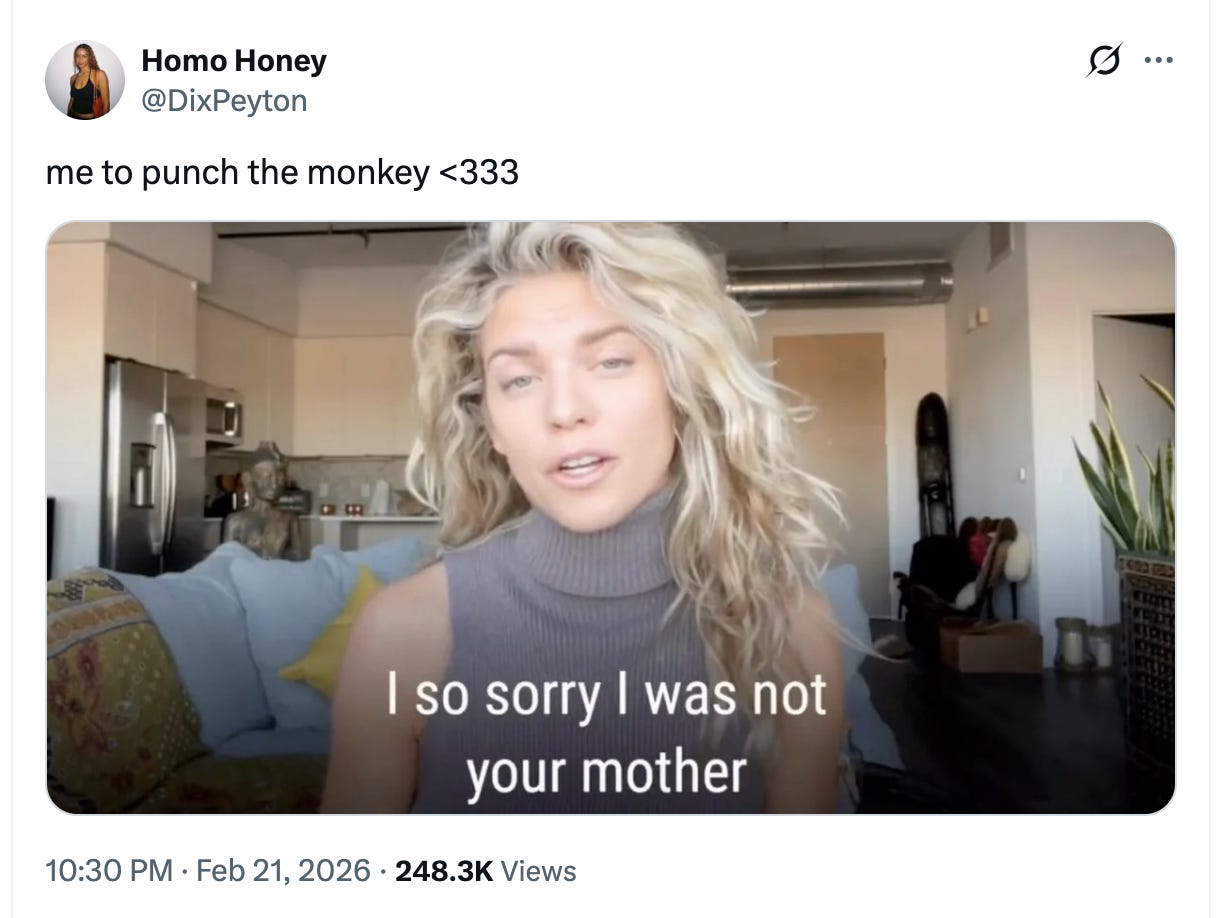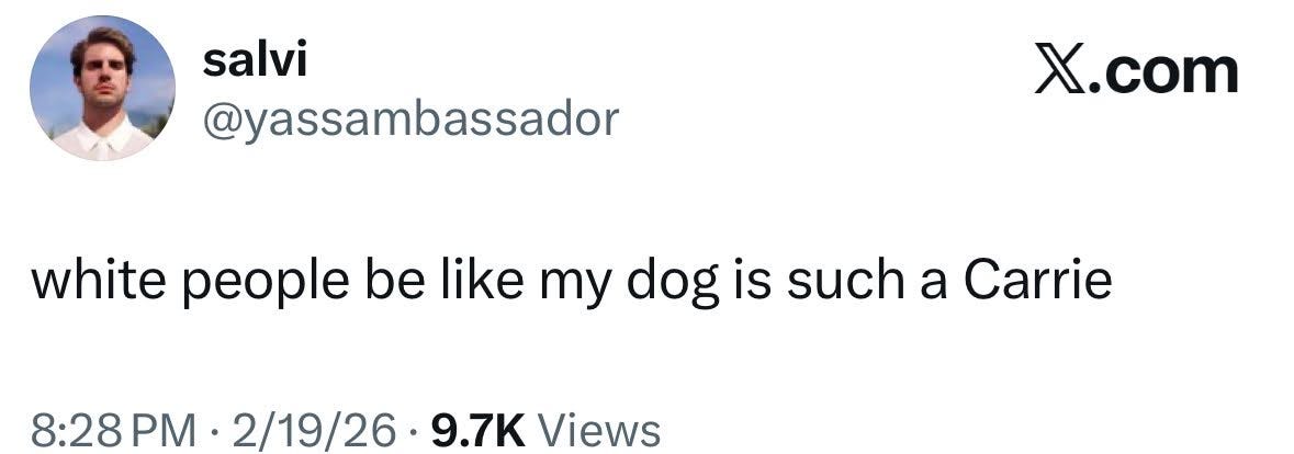 Winter madness has set in. Culture has gotten boring and stale. That’s what the internet is for. This is one of those trends where you go looking for the original to better understand the video on the For You page that is clearly referencing something, but once you see the original, it makes less sense. I like this meme because it has so many layers of abstraction from coherence that it’s not going to get too popular, and it can’t be used to sell something. Not to bring up everyone’s favorite incel for the 3rd week in a row, but our culture has become so steeped in the internet that someone like Clavicular can go mainstream. But Clav has a level of legibility that this doesn’t. We think Clav is as esoteric as we can get, but he’s as esoteric as we can sell. They feel similar because there are new nonsense phrases to say involved with both of them, but no one involved in this meme will be asked to walk in a fashion show. It’s nice to know that memes can still feel like outsider art and not just the first step in a marketing campaign/news cycle. There’s still fun to be had.