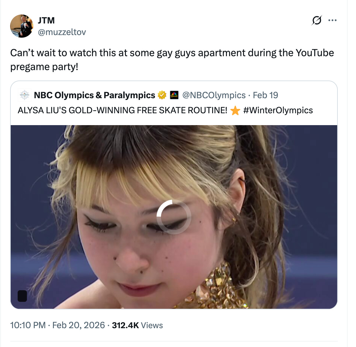 The thing with Alysa Liu is not about millennial burnout or even the importance of fun. Its the importance of “my terms” but only after you have earned it. It’s a good Olympics story that only works because of her previous Olympics appearances. By now, we are very familiar with the image of a too skinny child crying on the podium, scared of their parents and coaches because even though they medeled it won’t be enough. When we first met Alyssa, she was one of those girls, a phenom at 13 but obviously scared to death. For her, the return was enough, and the win was extra. I was happy with the story when it was about returning with fun. Of course the rest of you need the win too. The fun of a sports story is that you need the outside force of winning or losing to complete the narrative. The Olympics awarded her routine, which in turn awards her attitude, which gives us the happy ending we long for. She doesn’t need the win, but we do to tell our story. Just like Iliia needed the loss to make it all a better story in the long run. Also, it just feels like somebody should say that it feels like there might be an outsized reaction to seeing a happy 22-year-old who used to be an abused child when it seems the only two things people are talking about are the Olympics and the Epstein files.