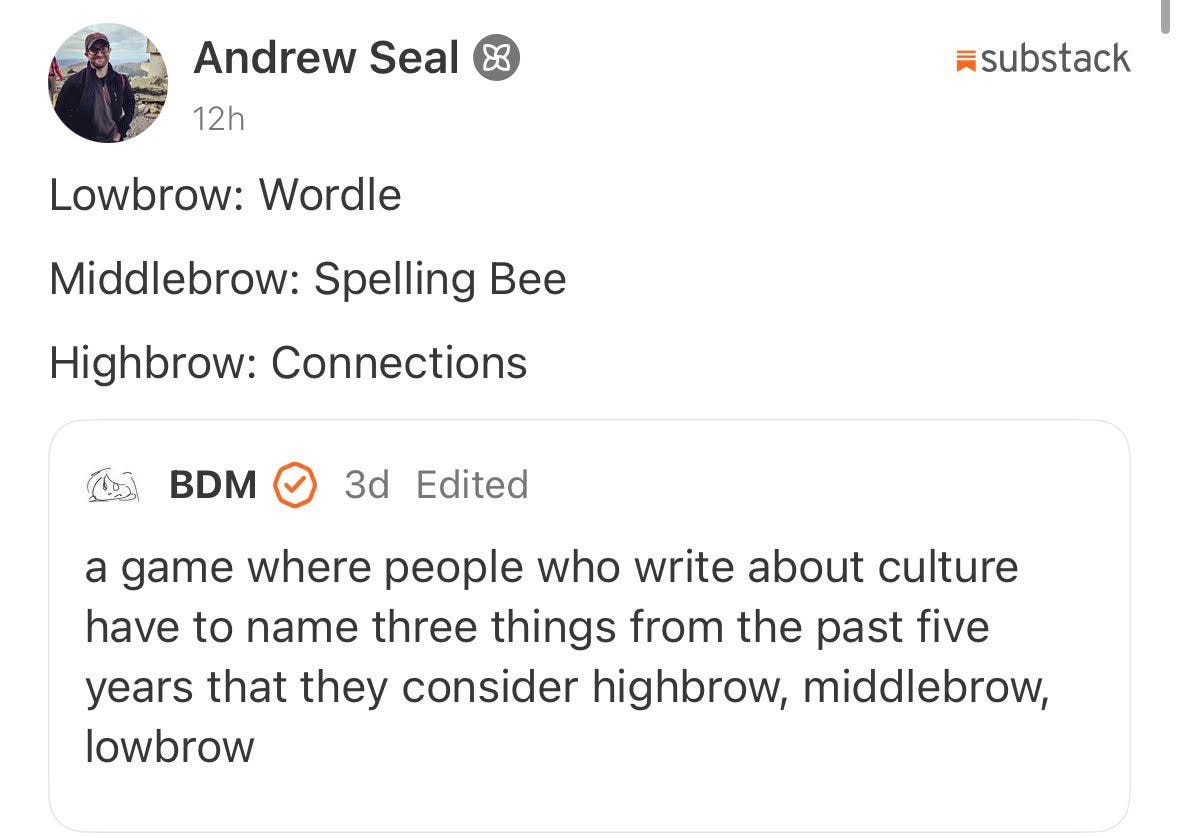 Notes is becoming a semi-interesting place to be on the internet. It’s not all the way there yet, so I can’t wholeheartedly endorse it, but as with any social media site, if you put in the work and find some favorites, there’s fun to be had. On Friday, BDM posted this note, which asked people to name three things: highbrow, middlebrow, and lowbrow. Everyone is obsessed with mixing high and low culture, but as the game pointed out, nobody really knows what highbrow means anymore. To me, it felt like a good ice breaker. If you’re on substack you know you’re surrounded by people who could be smart, interesting, and funny, but we’ve had no way to prove it except by trying to announce it to each other. This meme has been a dynamic way to see who is actually smart, interesting, and funny. That’s how all our favorite Twitter personalities cut their teeth. Let’s keep up the good work.