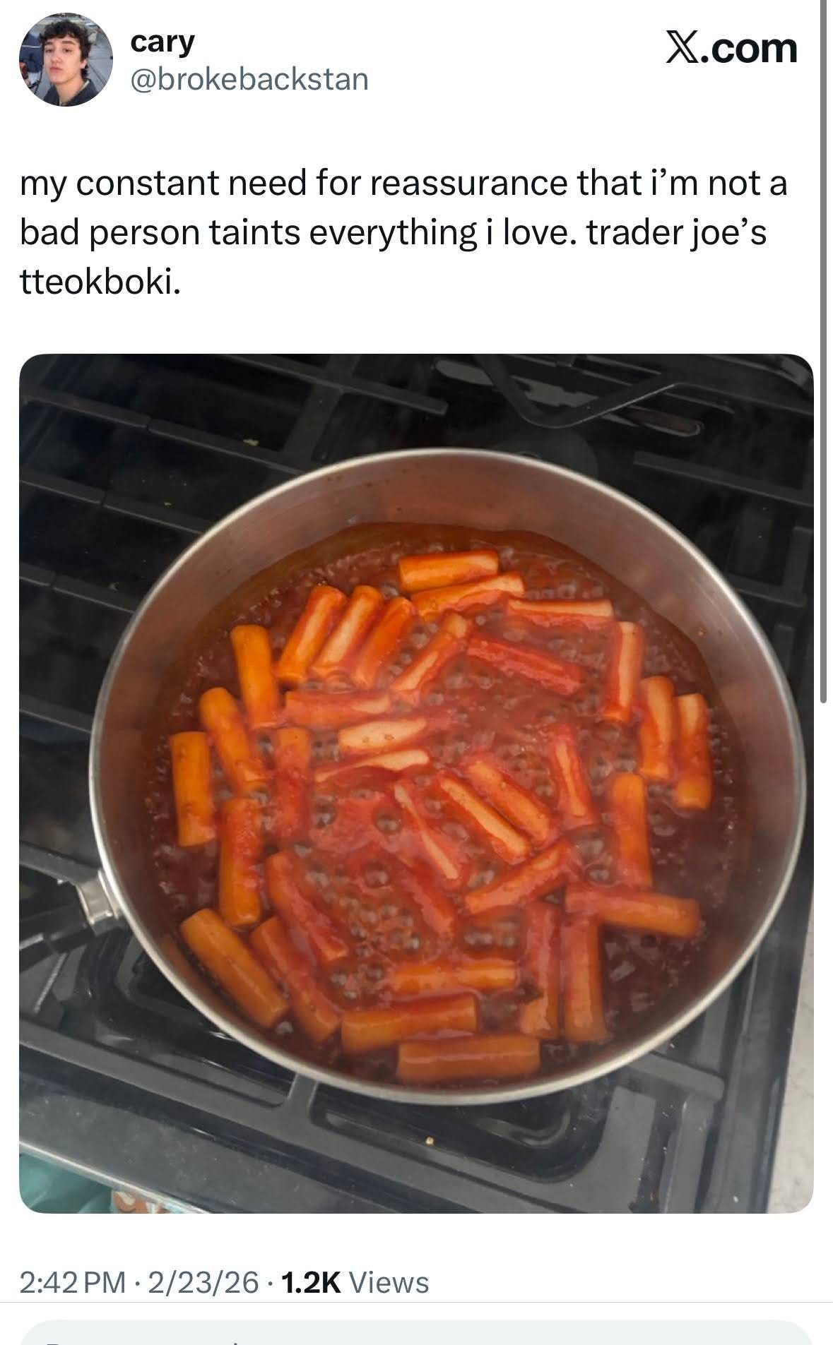 Twitter is still, to some extent, the town square of the internet. We are still able to dig up Reddit pages and shine a light on them, and have them gain a bit of notoriety. The latest to capture our attention is r/kitchencels, most notable for their unique style of posting a depressing thought or life update and the meal associated with it. Kitchencels is a rich text that gets at the bare bones of most posting on the internet, a depressing thought someone had, and a photo of the meal they are currently eating. What I love about these posts is that the meal always underscores the depressing thought. “What if I’m not capable of love? kraft mac and cheese.” We can almost see how one got to that thought from the meal they are eating. How, in the process of standing over the stove mixing the cheese packet in with the milk and the noodles, the mind takes stock of the whole situation and begins to wander. The kitchencels cadence is instantly recognizable both to the uninitiated as something universal and true and to the well-versed as a useful form that gets down to brass tacks. This is what I’m feeling, and this is what I’m eating. Fill in the rest for yourself. It’s like our version of a haiku.