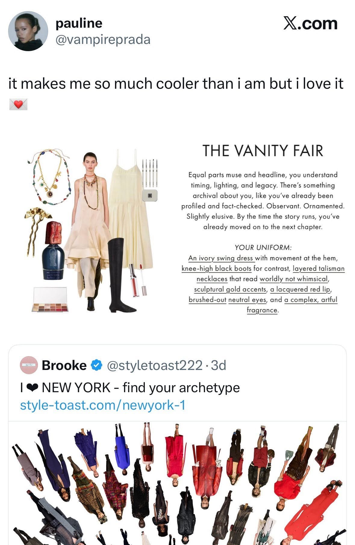 Say what you will about Buzzfeed, but they knew what they were doing with those quizzes. I want to know what I am and who I should be. We’re all a little gun-shy around quizzes now, and anyone who tries too hard to be the next purveyor of quizzes will be met with skepticism, but if there’s a one-off every now and then, we’ll eat it up. Brooke from Style Toast has gone viral once or twice before for similar quizzes, and they’re only getting better. There are enough different archetypes that I didn’t feel like one of 4 easy options. Though I am one of the rare few who chose Fran Lebowitz as a style Icon over Donatella Versace, I didn’t see anyone else with the same archetype as myself. I loved this brief return to quiz culture and sharing our results, knowing that it means 6 more months without quizzes. I was surprised to see who among my cadre of Twitter and Substack girlies took the quiz. There were the usual marks, but also a larger number of girls who seemed too good for something like this who were participating. We all want to be a New York fashion archetype, even if we don’t want to admit it.
