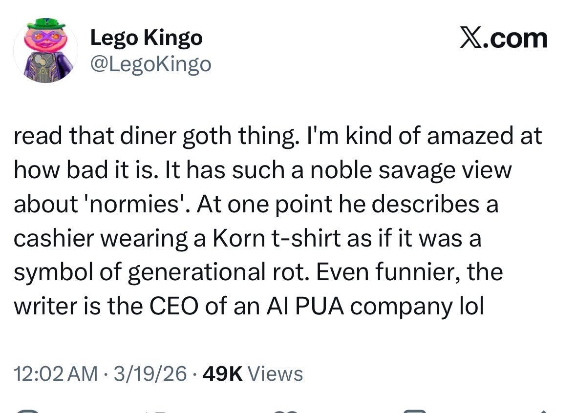 I do think this subculture spends as much time on the computer as a West Village girl and her imitators, but the West Village girl uses her time on the internet to craft her image so it translates more readily to the real world. She uses her phone to prepare for the world while the “diner goths” bring the phone into the world. We hate the West Village Girl, too. So there’s no winning. We are all addicted to our phones, and it informs our aesthetic choices. The people with more money and better taste in general end up looking more presentable and desirable, and the people who don’t want to play that game and can’t afford to, dress in a way that makes them feel comfortable. The tech guys wring their hands, wondering what we all know that they don’t.