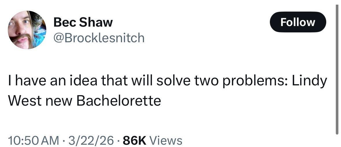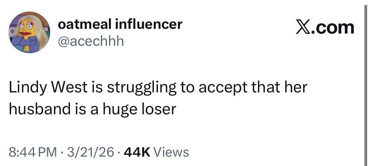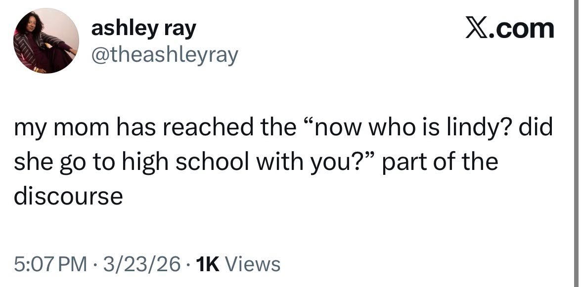 If you are a real Substack head, there are probably people you trust and go to and expect to write about Lindy West. I liked Default Friend and saw a lot of people show enthusiasm for Cartoons Hate Her’s take. Other people will chime in shortly, now familiar names and faces. We’re rebuilding. But these people are not Lindy West’s peers the way they used to be. It’s not a fair fight anymore. Lindy West has multiple books under her belt and a TV show to her name. She won the blogosphere game the rest of us are still playing to diminishing returns.