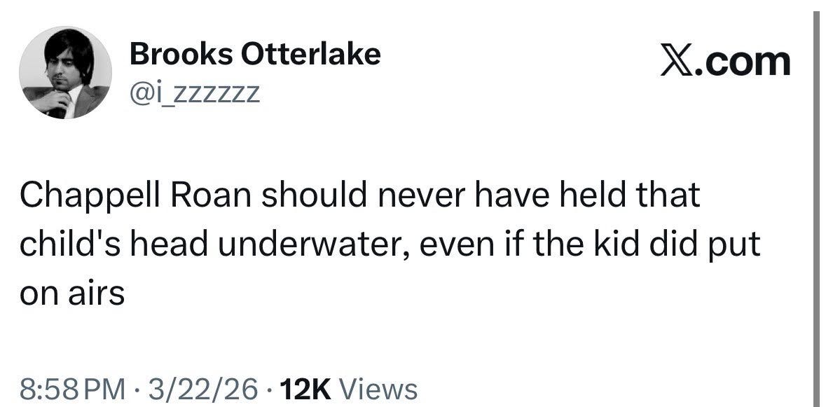 I’ve made my thoughts on Chappel clear. This is obviously stupid, and I’m not on the side of anyone who takes to Instagram to write a paragraph of text. There are also too many people removed from the actual incident. The story is all nuance and technicalities, which is a lot to ask for in an Instagram essay. It is asking to be interpreted as Chappel hit a kid, even though that’s not what happened, and the response from everyone is, who cares? If you want us to fall for this, the story has to be cleaner and clearer, and Chappel needs to have a hit on the horizon. Otherwise, it’s a non-story. It’s already a non-story, but your honor, relevance?