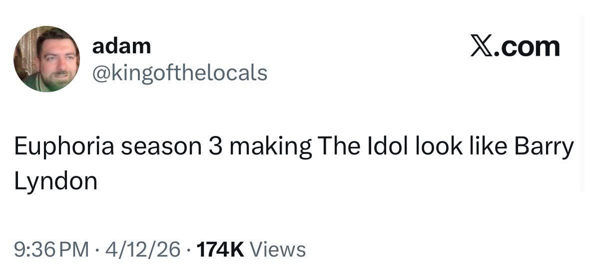 The discussion online, without much plot to go on, is about the degree to which Sam Levinson is a problem. Sam Levinson’s crime is being a pervert and it has yet to be worse than that. We want it to be worse than that but no one’s come forward yet so all we can accuse him of is leering and “being a creep”. Unfortunately, that’s like half of cinema. It’s bad for women in the same way the Special K diet was. It’s not worse than that, yet. It doesn’t disqualify him from making good television. That’s everything else that’s wrong with him. The audience hates him for this but can’t look away. This season is a test of when we will. Anyone can start a story from an interesting and provocative place, let’s see if he can finish it.