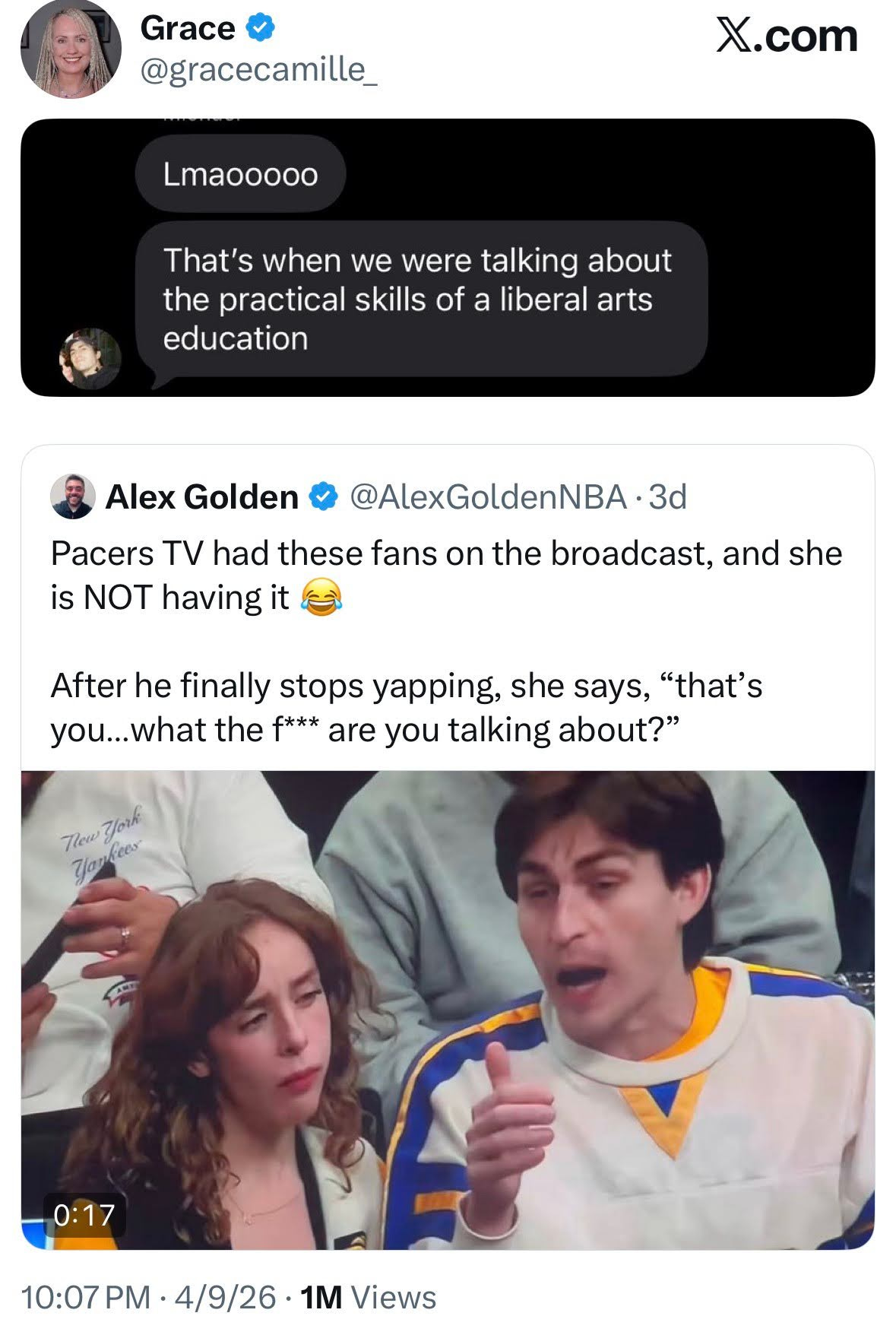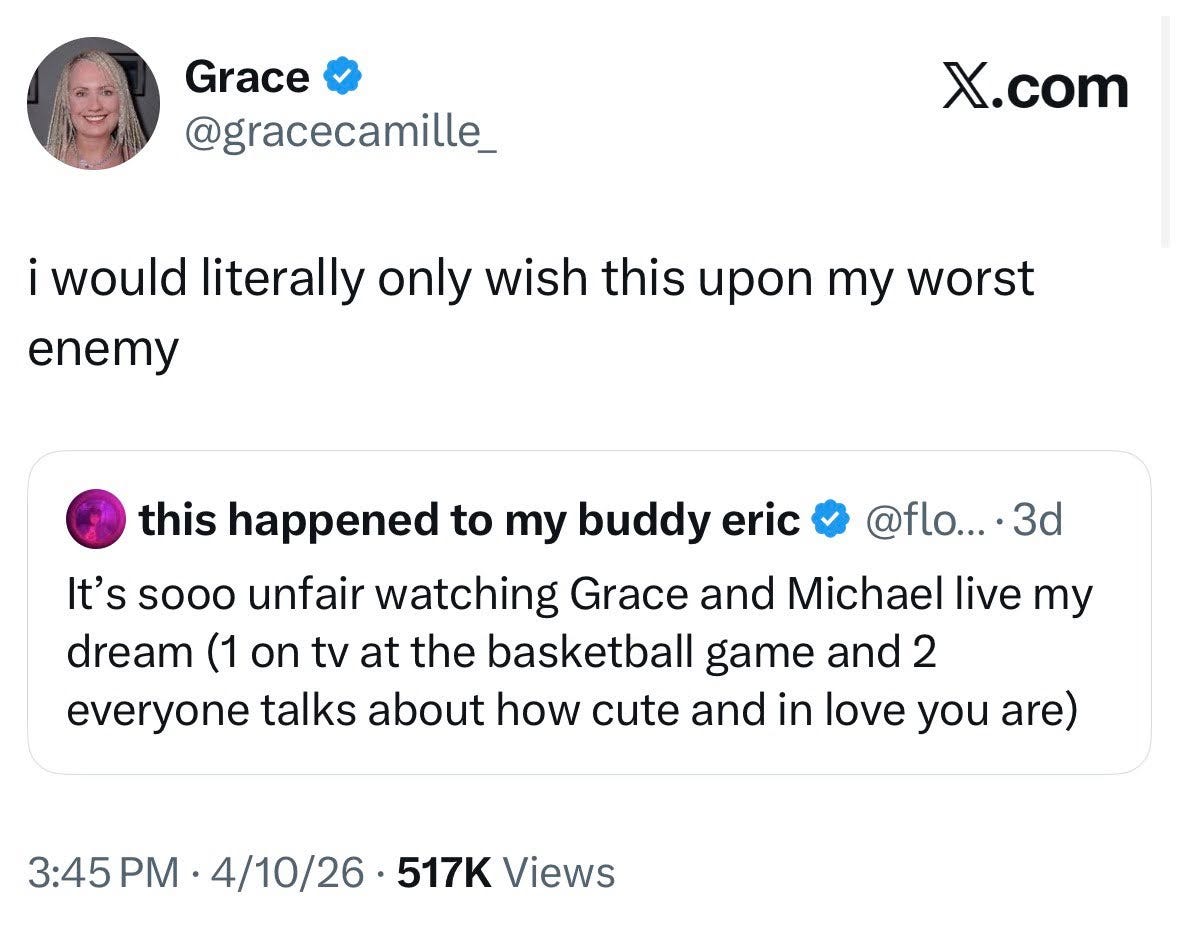 Twitter these days is a cesspool and sports media at large is famously not kind to women in its orbit, especially the fans. We saw everyone’s reactions, from “me and who?” to “she hates him” to Murray Hill Guy calling her a “beautiful mid”. I watched as my parasocial “friend” was thrown to the wolves and saw everyone else develop a less informed parasocial relationship with them. Every time I saw someone react to the meme out of context I thought “you don’t get it”, Even though I don’t get it either because I don’t know these people. We just have the same amount of screen time, reference points, and a few gay guys in common. In some cases that’s all it takes and is more than most. I will say Grace seemed to ride the wave of attention for all it was worth with minimal damage to her sparkling reputation. She still has my follow but she always did.