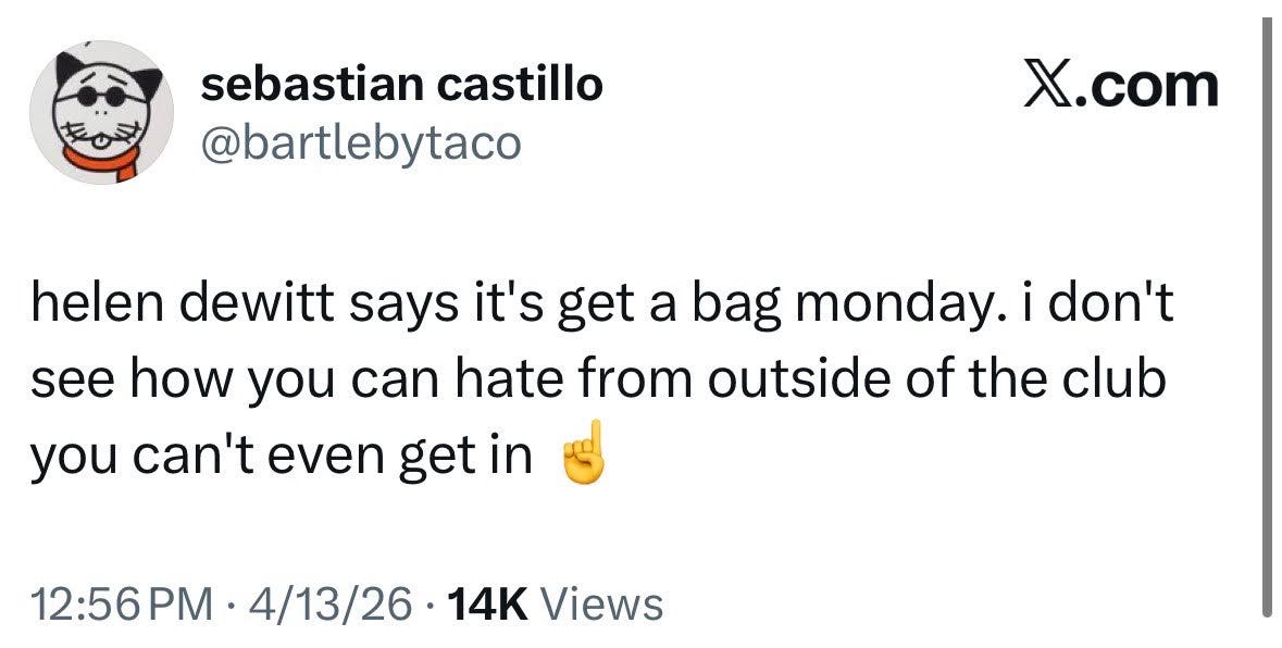 Last week, I talked about how book people are really funny when they argue about fame and deserved praise because they are often unwilling to play to the larger culture of publicity, and the larger culture of publicity is for the illiterate. After that was published there was a scandal about that very thing. Helen DeWitt had to return a large literary prize because she wasn’t up to the task of the publicity along with it. This sparked a days long argument about the role of writer/genius in society and also, depression. Before she won the prize, I didn’t really know who she was but now I’m familliar not only with her work but her social media pressence. I believe in PR, they call that an Uno Reverse. She doesnt want to do promotional work which is a shame because shes great at it! Get her on subway takes! Give her the money to hire an aide to get her wifi up and running so she can go on How Long Gone. I fell to my knees upon discovering she splits her time between Berlin and Vermont, a state filled almost exclusively with genius shut ins who pretend they don’t know how to use the internet. She needs to go on Call Her Daddy.