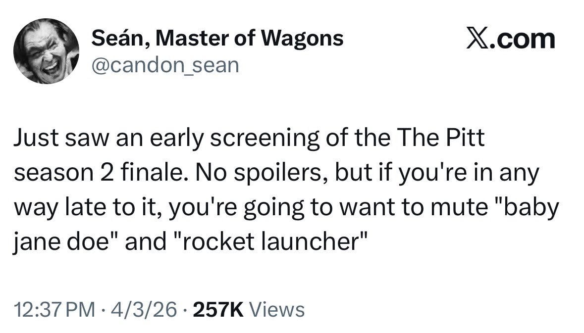 What was last year’s best drama, and the hope for modern television has devolved into a total mess on Twitter, the arbiters of taste. As I’ve said before, I don’t watch The Pitt because I don’t watch Hospital shows, but watching people watch The Pitt has quickly become my favorite pastime. The show comes out once a week, and it’s mostly medical garbage that’s not interesting, with about 5 minutes of character development per the cast’s 1000 characters. The people on Twitter must turn this into a week of analysis, and there’s not much to go on because next week we’ll pick up right where we left off, down to the minute. It is crazy making if you’re that kind of fan. Watching them go crazy is really fun. As for the behind-the-scenes drama, I think you’re allowed to have speculations and notice a pattern of behavior, but I think we can’t accuse people of being abusive to the staff based on vibes and connected dots. I can’t wait until next year when watching The Pitt is considered a guilty pleasure by good upstanding woke TV watchers and Landman, the most watched show in America, continues to be consumed uncritically.