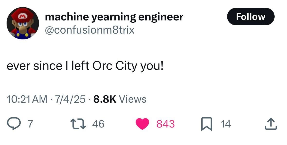 On a holiday weekend (in America), when everyone is bored and drunk and sunburned, in a moment of phone time, perhaps in the air conditioning or under a beach umbrella, Twitter users engaged in a collective creative writing exercise about Orc City. Orc City was the creation of an author who had the gall to criticize Hideo Kojima. He put himself in the line of fire. A good portion of people still active on Twitter are almost all that exact kind of nerd. They love things like Orc City and want to protect it and cherish it. They also want to brutally make fun of anyone who would tarnish the good name of something like an Orc City. They are also huge nerds about other aspects of city life, so the fact that Orc City is, in fact, a City opens up a whole new world for them. Is Orc City walkable? Are they gentrifying Orc City? Etc., etc. It was a perfect storm for some, and like any good summer storm, watching it play out in the vivid memetic imaginations of true nerds was beautiful to watch.