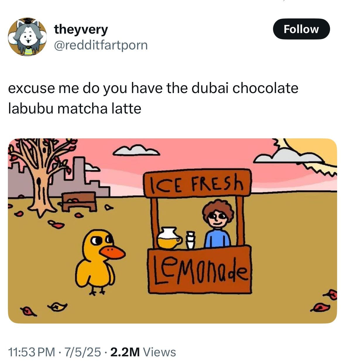 The Labubu situation is getting out of hand. Every day, someone makes me read the words “Labubu dubai chocolate” because culture is ultimately ruled by idiots with money to burn. However, the Labubu has taken on a life of its own as “the thing,” which is bigger than the object itself. Now we must discuss the nature of trends, objects, and fascinations. I can’t believe we’re doing it over something so ugly. The Labubu won’t last us until Christmas, and it’s just a matter of time until we’re on to the next thing. It’s the moment you finally give in that it’s over. So stay strong, or give up. Either way, it doesn’t matter; the choice will be wrong, and Labubu will be all too fleeting.