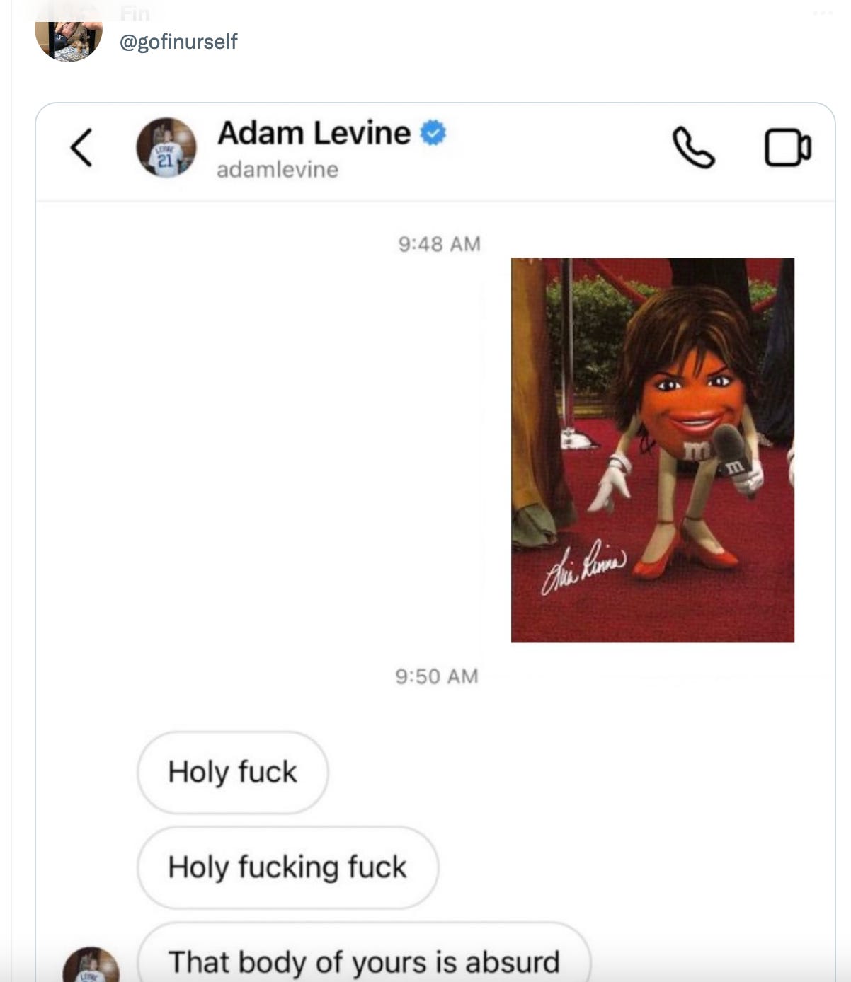 I love when a meme is a thunderdome. 5 formats enter, 1 format leaves. Ultimately your body is absurd won. It makes sense that it won. It requires the least amount of original thought and the instructions are clearest. All we need to do is find an image. The others required a little word play and thinking outside the box. It ultimately doesn’t matter what won because the fun was finding your own Adam Levine text and seeing what you could with it. There was a mad rush and the result was a really fun day on the internet. After endless cheating discourse, we finally got something out of it. Not an answer, but a fun activity. A somewhat unique fun activity because we got so many different memes out of it.