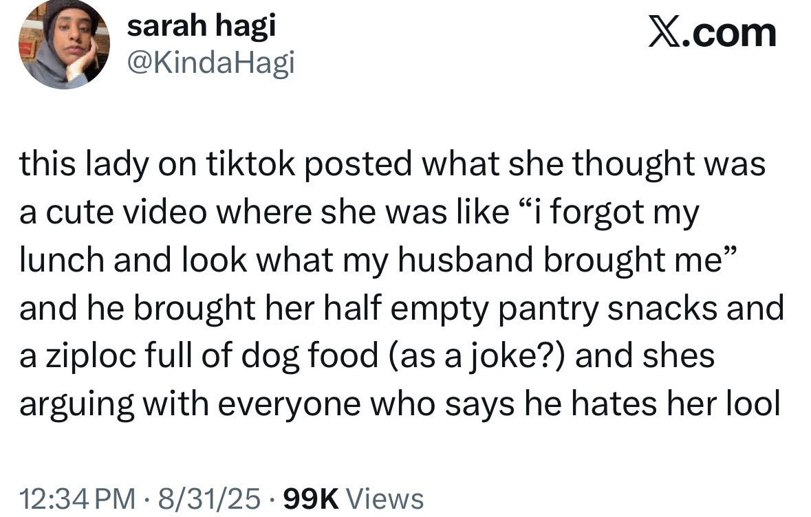 I don’t think he hates her! Sorry! Every argument that claims the woman with the packed lunch ignores the smoking gun of the whole thing: The Chipotle leftovers. Here’s what happened. The husband is asked to pack her a lunch on short notice because she forgot hers. He, in addition to a full meal, includes a bag of dog food as a joke. It’s hidden so she will find it last, after her nutritious lunch, a well-executed joke. Then he places the Chipotle leftovers on top. We never see how much is in the Chipotle leftovers, but I’ve never seen a woman of her stature come even close to finishing a Chipotle bowl in one sitting. There’s at least half a serving of Chipotle in there. That contains rice, beans, a protein, probably lettuce, and mild salsa. Maybe corn. MAYBE sour cream, but not likely. No cheese. That’s most of a complete meal. Of course, he could only judge by weight, and perhaps he felt it was not enough. I don’t think it’s a crime to put whole packages of food in an emergency lunch when you are unsure of how much Chipotle your wife has left. Would you rather be in a marriage where a man doles out how many cookies he thinks you should eat in a Ziploc bag or a marriage where he gives you the whole package to make sure you have as many as your heart desires? The dog food was to make her laugh, and it did! The Chipotle leftovers are fine in an emergency! The other snacks were to make sure she had enough to eat! I do not think the lack of Ziploc bags is indicative of a simmering hatefulness. In fact, I find the lack of them an expression of love. As for the dog food, she thought it was so funny, she made a video about it!