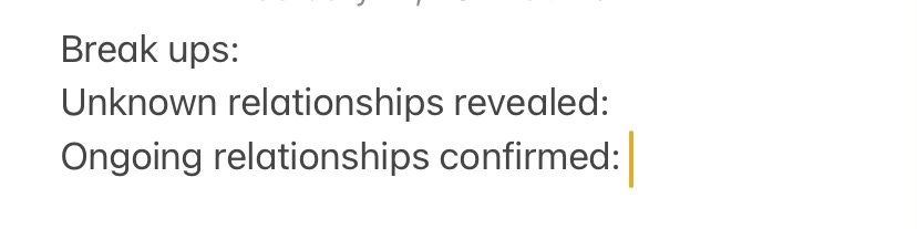 In the note, you will create three categories. Ongoing relationships confirmed, New relationships revealed, and break ups. As the day goes on you will keep a tally of all of these things. Ongoing relationships confirmed is easy. These people either post frequently with their significant other or have not broken up with them since last valentines day (or their birthday). The second one is my favorite. I love the culture of the boyfriend soft launch. Loving the culture means loving the entire spectrum. It’s one thing to soft launch on a random Tuesday or weekend in the summer. What’s the least amount of man you can put on an instagram story and still have people understand that he’s your boyfriend? The other end of this spectrum is saying nothing about a man who basically lives with you until Valentine’s day. It’s the long game and I will always support the long game. Quietly joining the ranks of boyfriend girlies months ago and saying nothing publicly until the day when everyone does. It’s genius. Nobody will notice. Except me. I always notice.